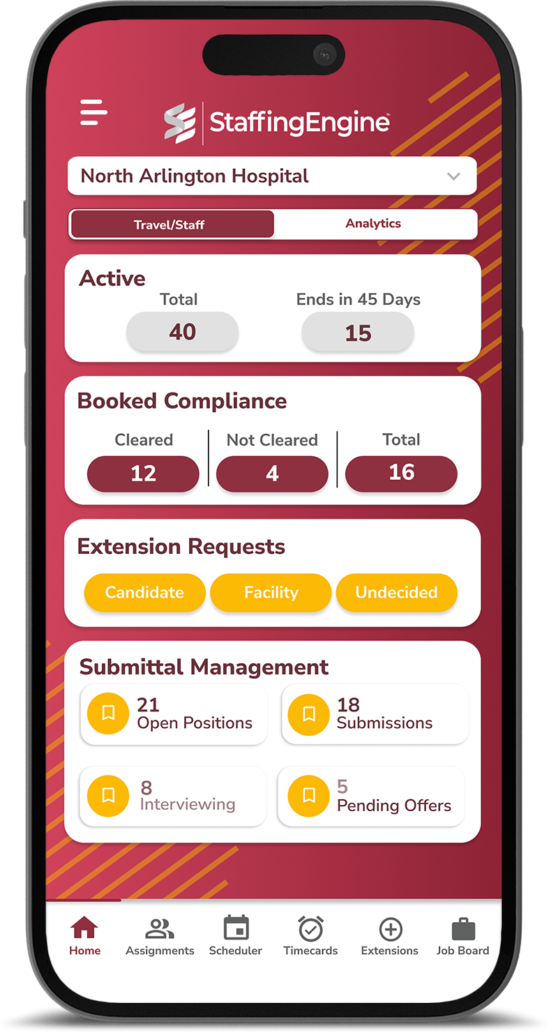 StaffingEngine is a VMS unlike any other. Established by industry experts, our approach addresses the primary pain points your facility faces in securing a qualified contingent workforce quickly and efficiently. We significantly reduce your workload at high cost savings, bringing you vetted, quality talent while providing you with total control over hiring.
